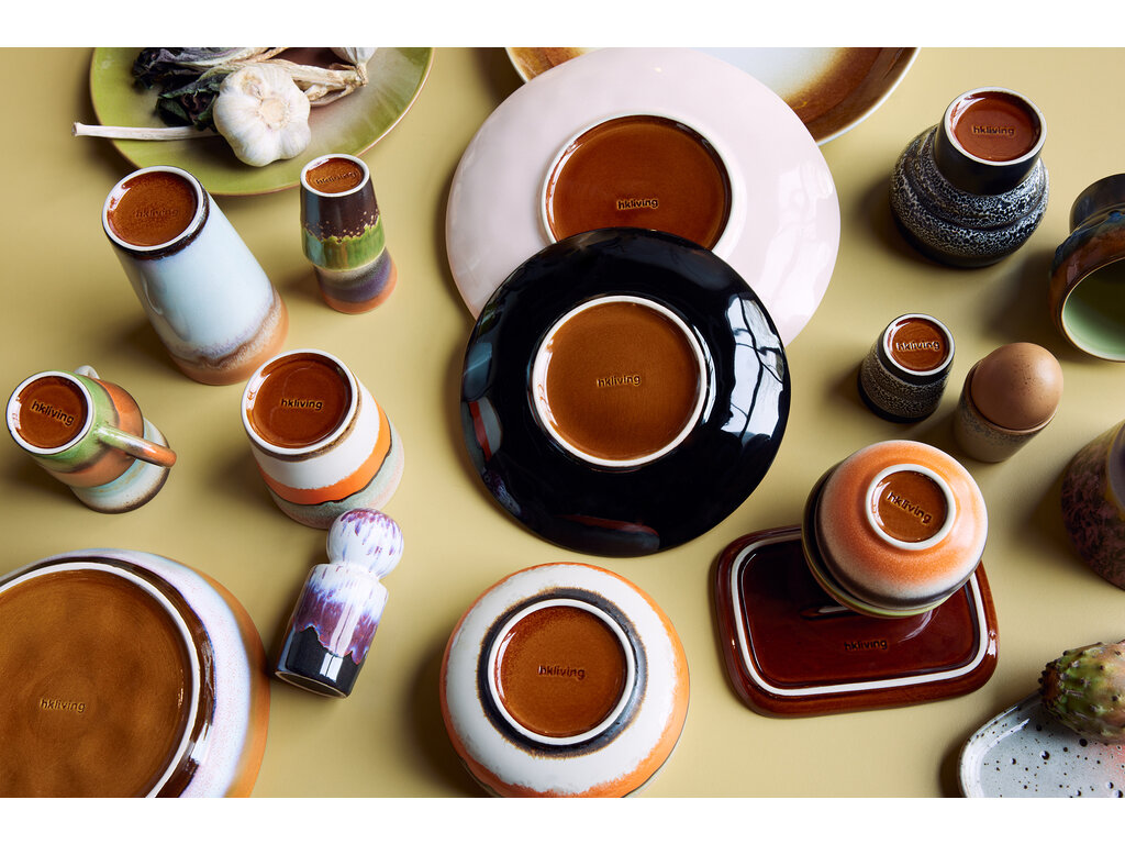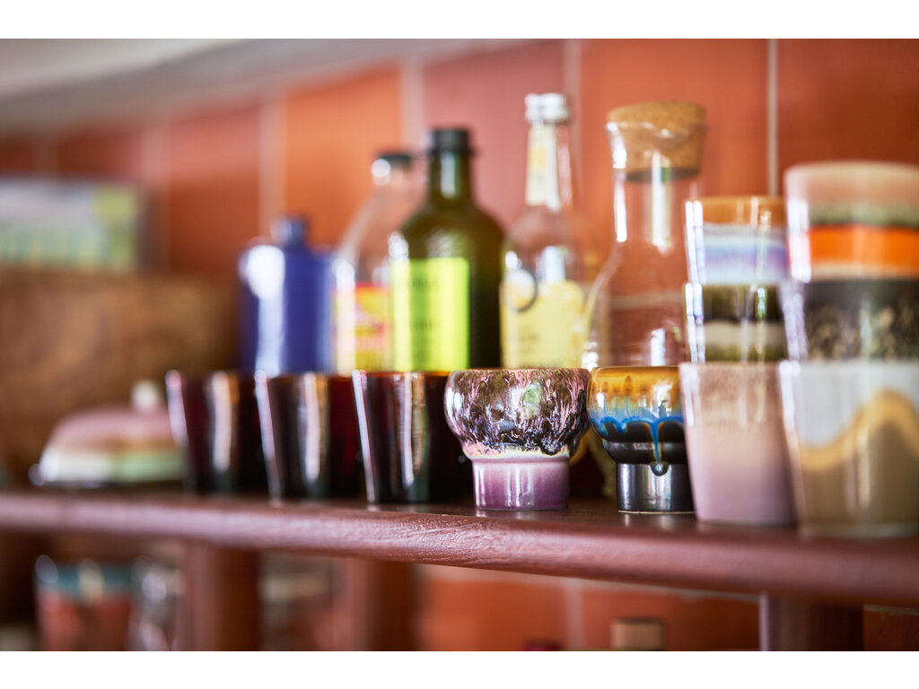 De gebogen mokken zijn een speelse toevoeging aan het keramiek van de jaren 70,