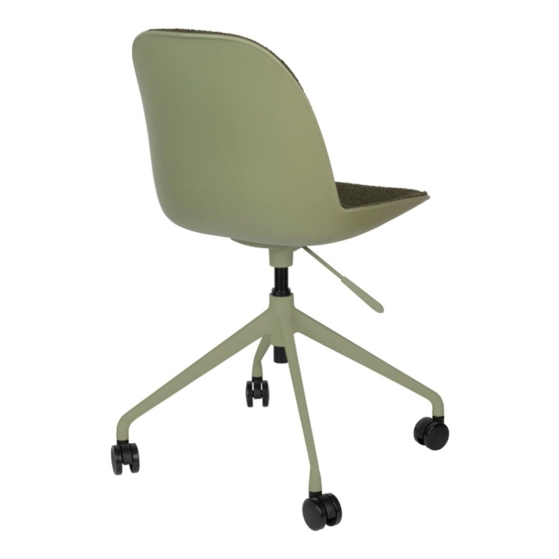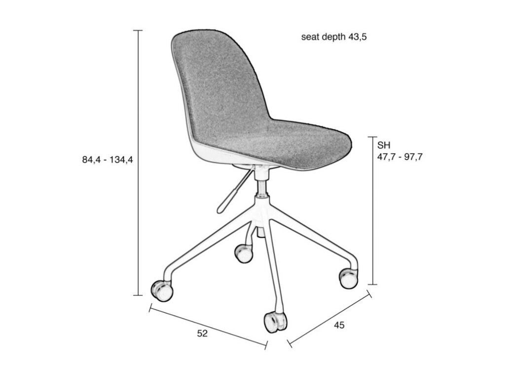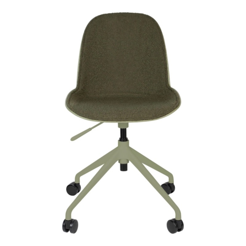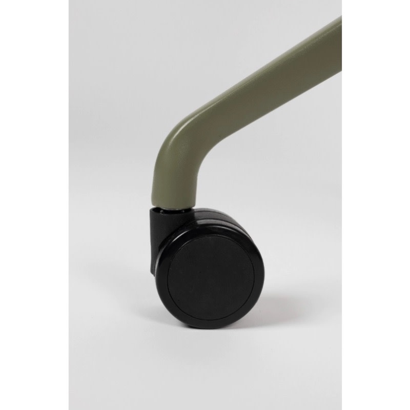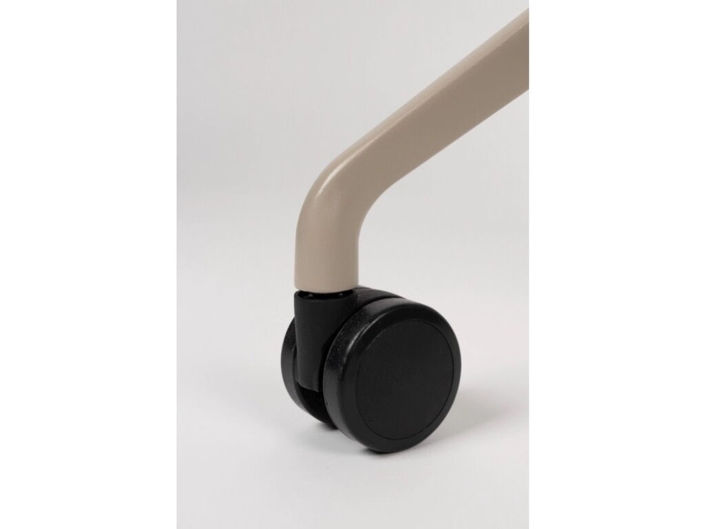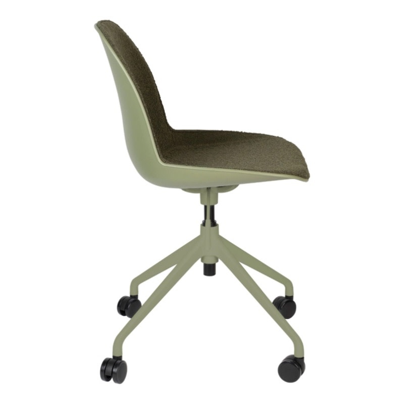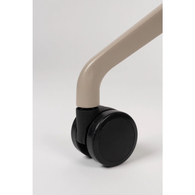 Een reeks van zachte polyester zitvlakken die in verschillende kleuren voorkomen: taupe, groen & wit en dit met of zonder armleuningen. Deze zijn ondersteund door een aluminium onderstel op wieltjes die deze bureaustoel zeker comfort brengt. Verstelbaar in hoogte door hendeltje die aanwezig is,