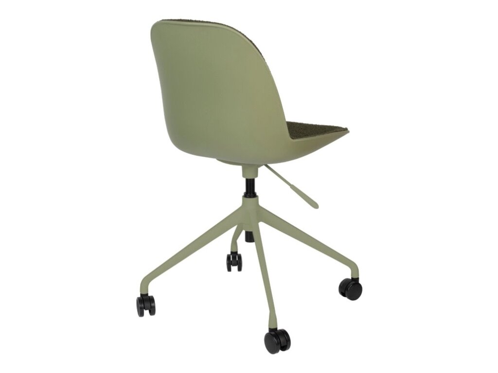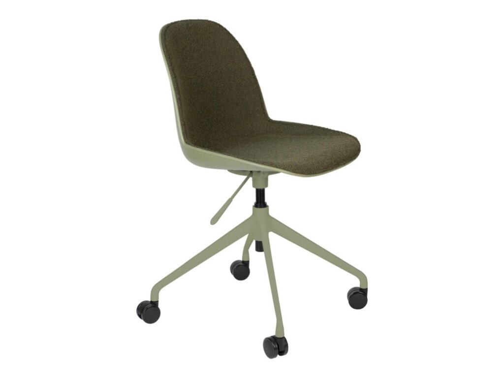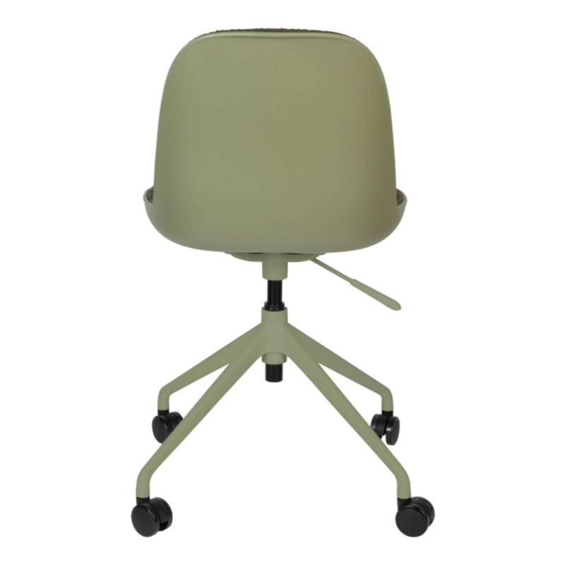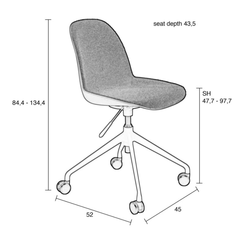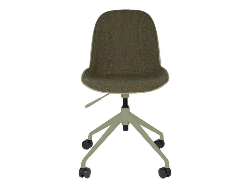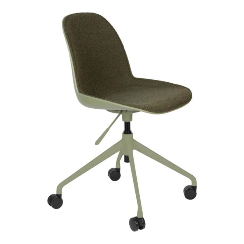 Een reeks van zachte polyester zitvlakken die in verschillende kleuren voorkomen: taupe, groen & wit en dit met of zonder armleuningen. Deze zijn ondersteund door een aluminium onderstel op wieltjes die deze bureaustoel zeker comfort brengt. Verstelbaar in hoogte door hendeltje die aanwezig is,