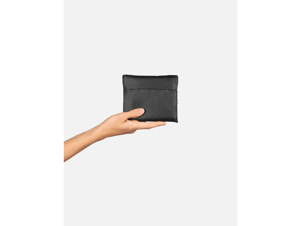 Als je de tas niet gebruikt, vouw je hem in die zak en wordt het een handtasje.