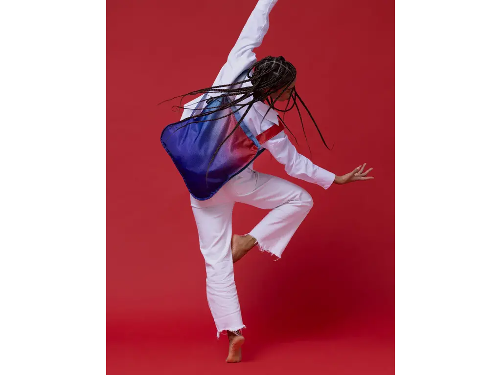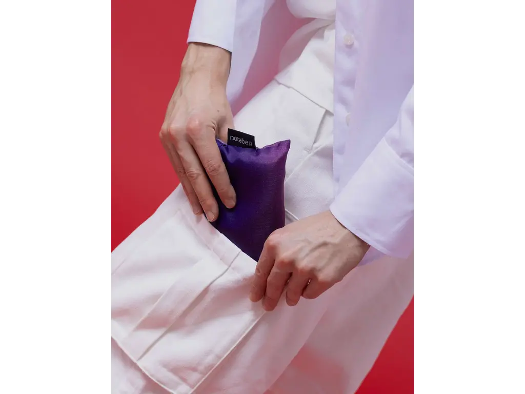 Als je de tas niet gebruikt, vouw je hem in die zak en wordt het een handtasje.