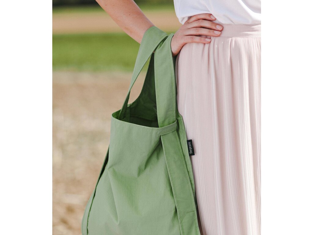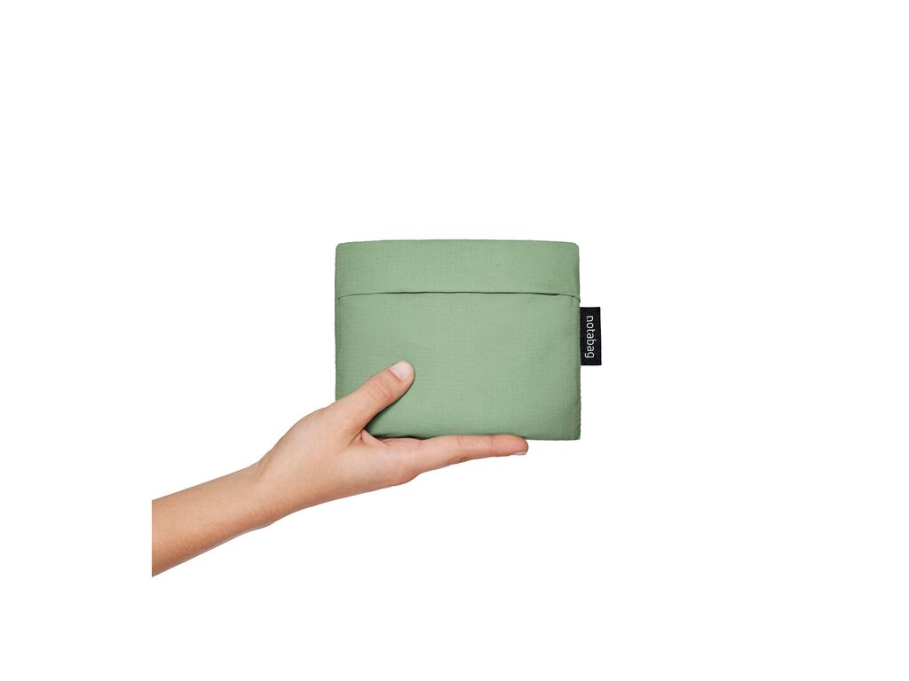 Als je de tas niet gebruikt, vouw je hem in die zak en wordt het een handtasje.