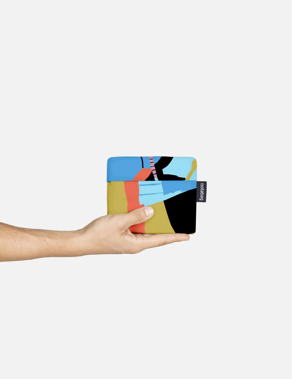 Als je de tas niet gebruikt, vouw je hem in die zak en wordt het een handtasje.