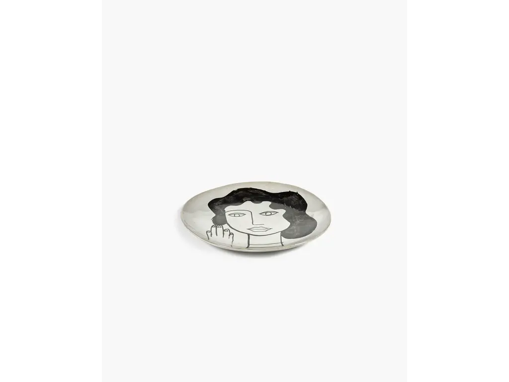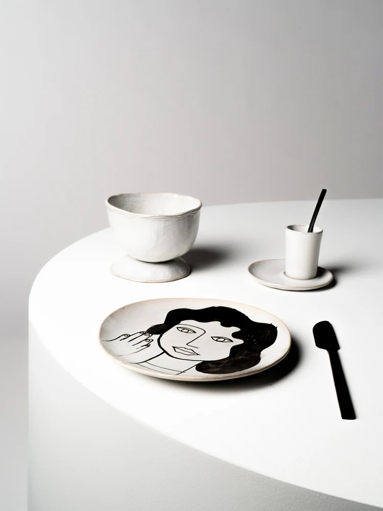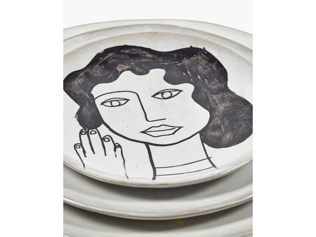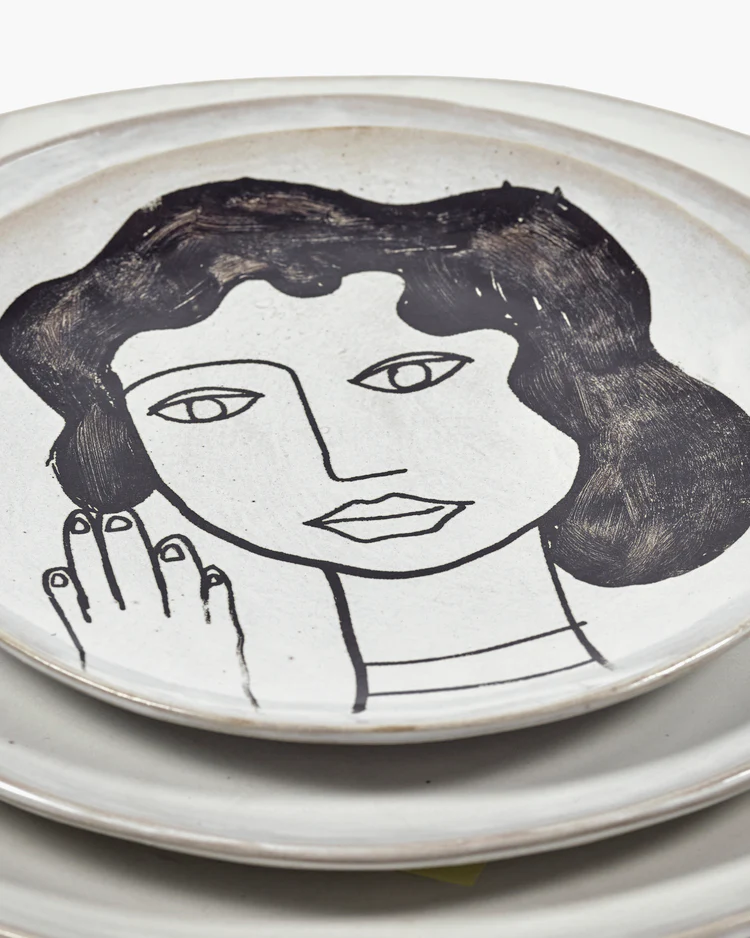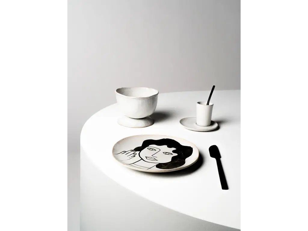 Dit middelgrote bord uit de La Mère-collectie van Marie Michielssen combineert ambachtelijk vakmanschap met emotionele diepgang. Het witte glazuur, zorgvuldig aangebracht op met de hand geboetseerd steengoed, vormt het canvas voor een zwarte illustratie die symbool staat voor de moederfiguur – het hart van de collectie.