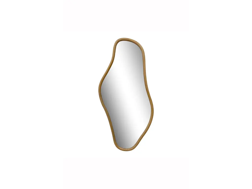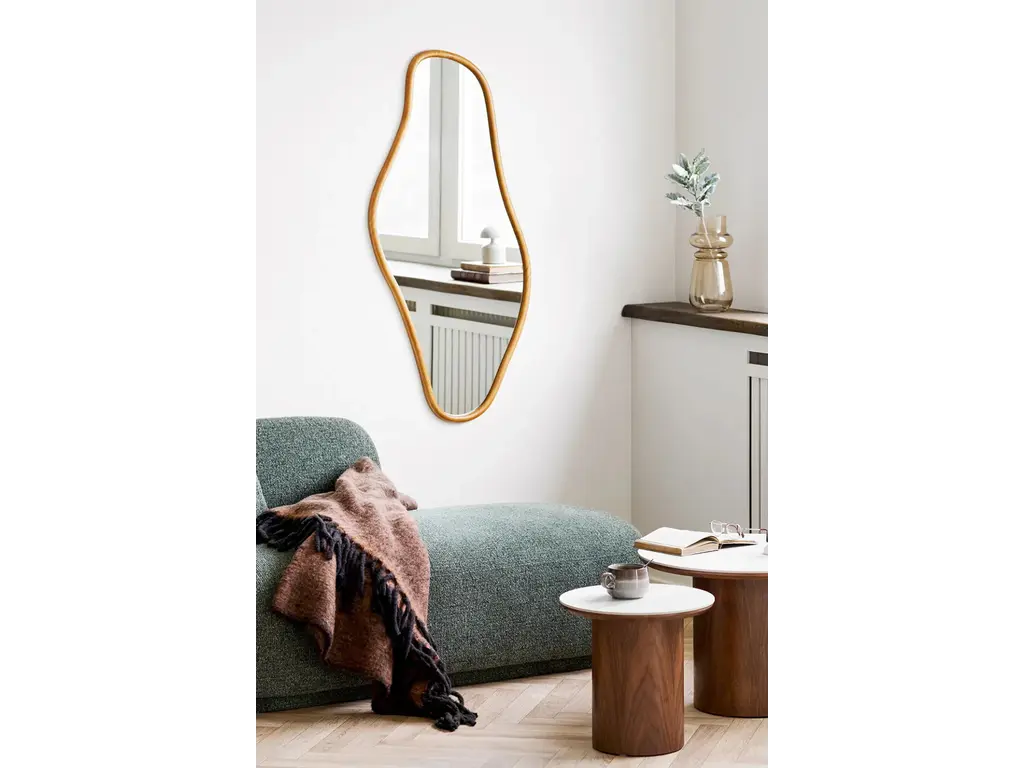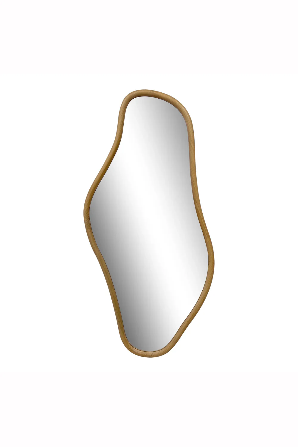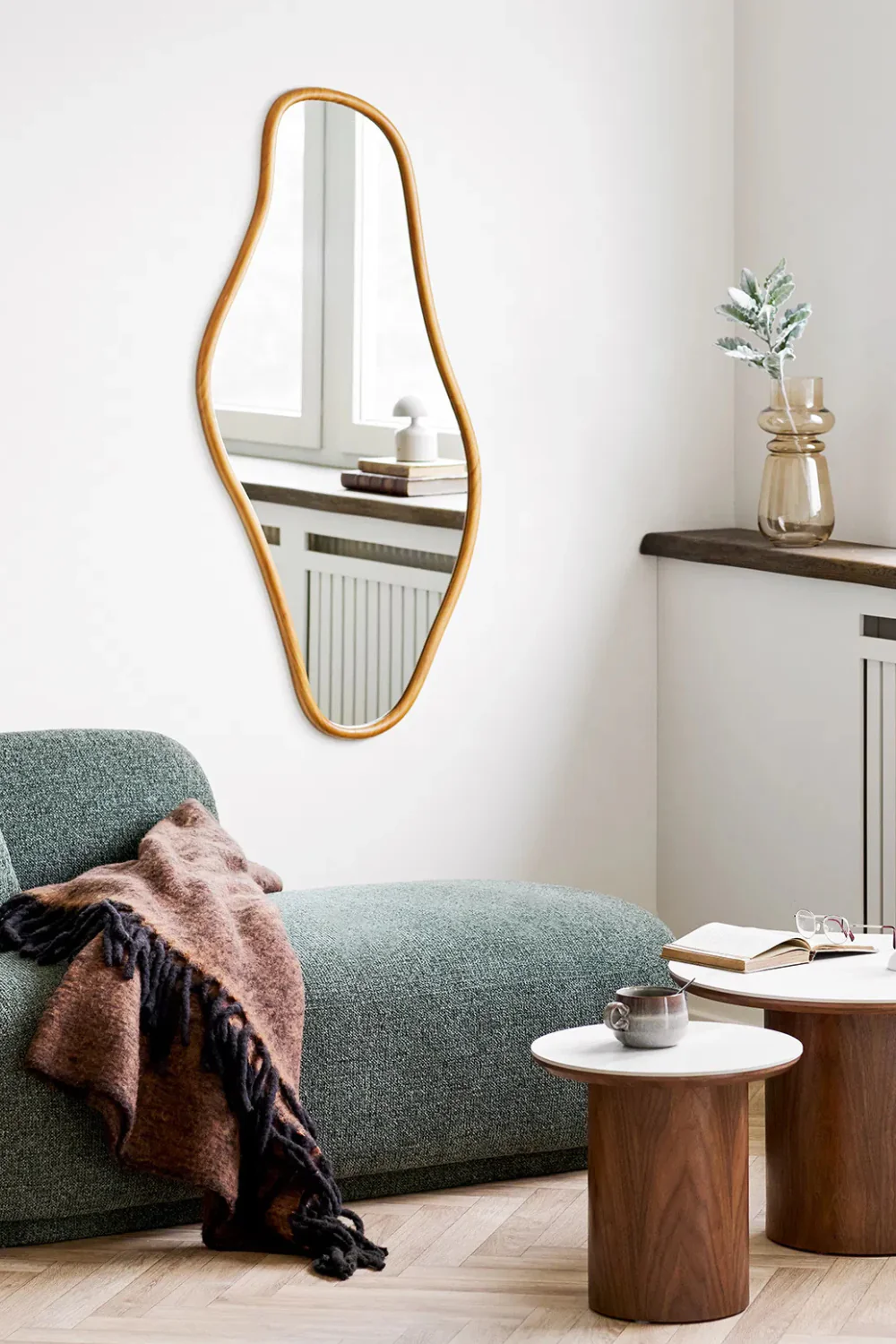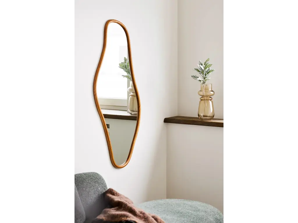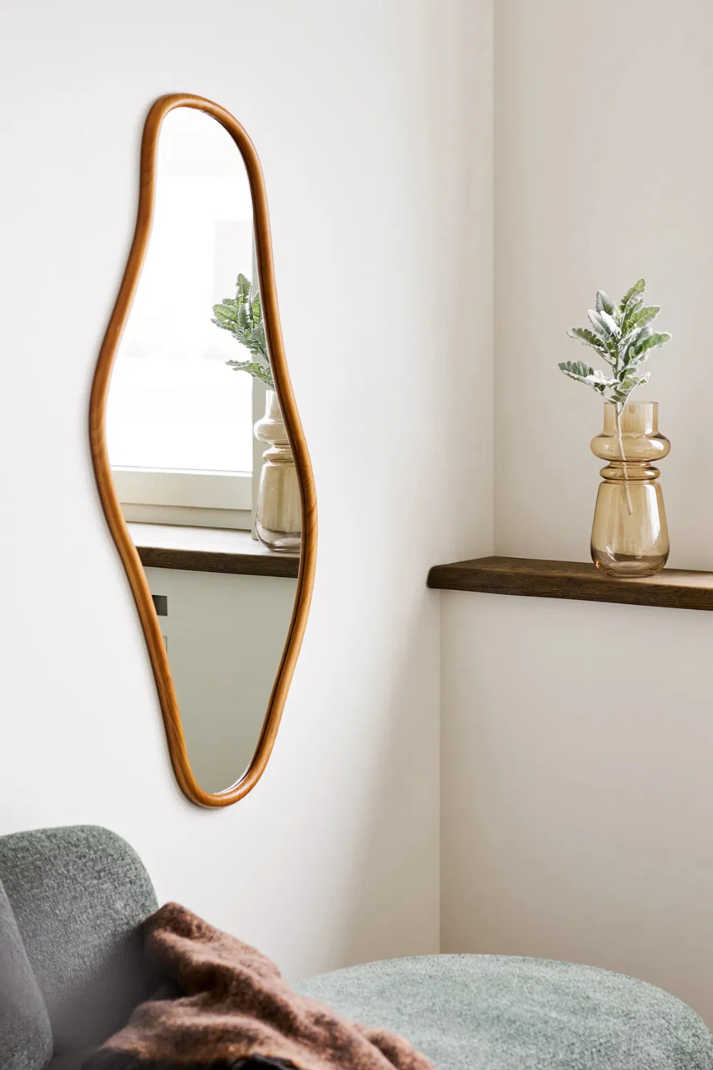 Account aanmakenEen spiegel met een zachte, organische vorm en een natuurlijk houten frame.