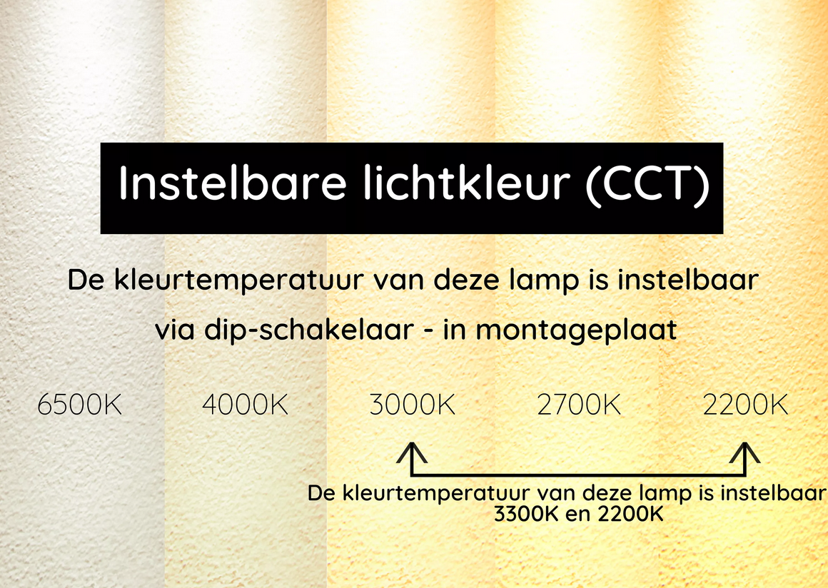 - Kleurtemperatuur instelbaar via DIP-schakelaar in montageplaat (2200K-3300K)