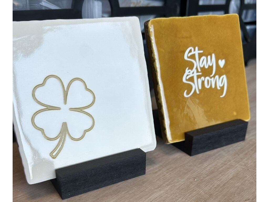 Met onze displays geef je jouw favoriete tegel een mooi plekje in huis. Simpel, stijlvol en speciaal gemaakt voor ons tegel-formaat. Of je ’m nu op een plank, tafel of nachtkastje zet – dit is de finishing touch die jouw quote laat stralen.