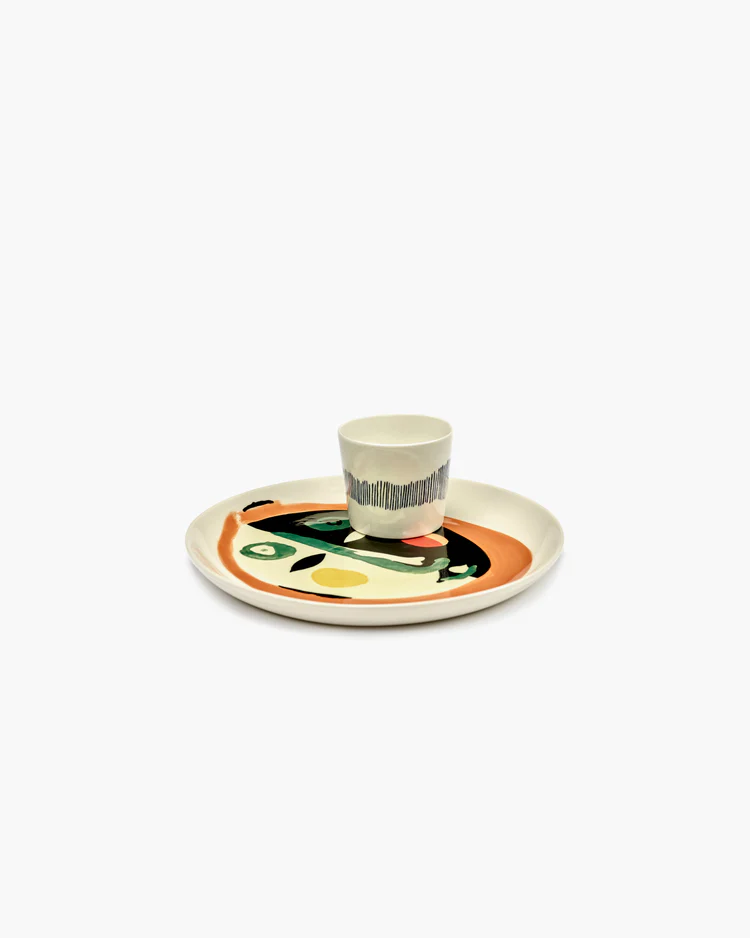 Dit luxe bord van steengoed, ontworpen door kunstenaar Ivo Bisignano, combineert kunst en functionaliteit. De abstracte gezichtsillustratie en de semi-glanzende glazuurafwerking geven het bord een unieke, expressieve uitstraling. Perfect als opvallend stuk op tafel of als decoratief object.