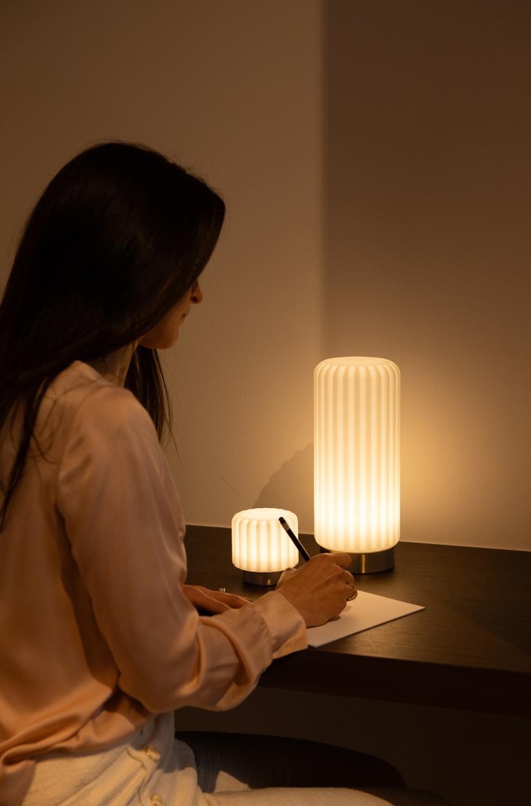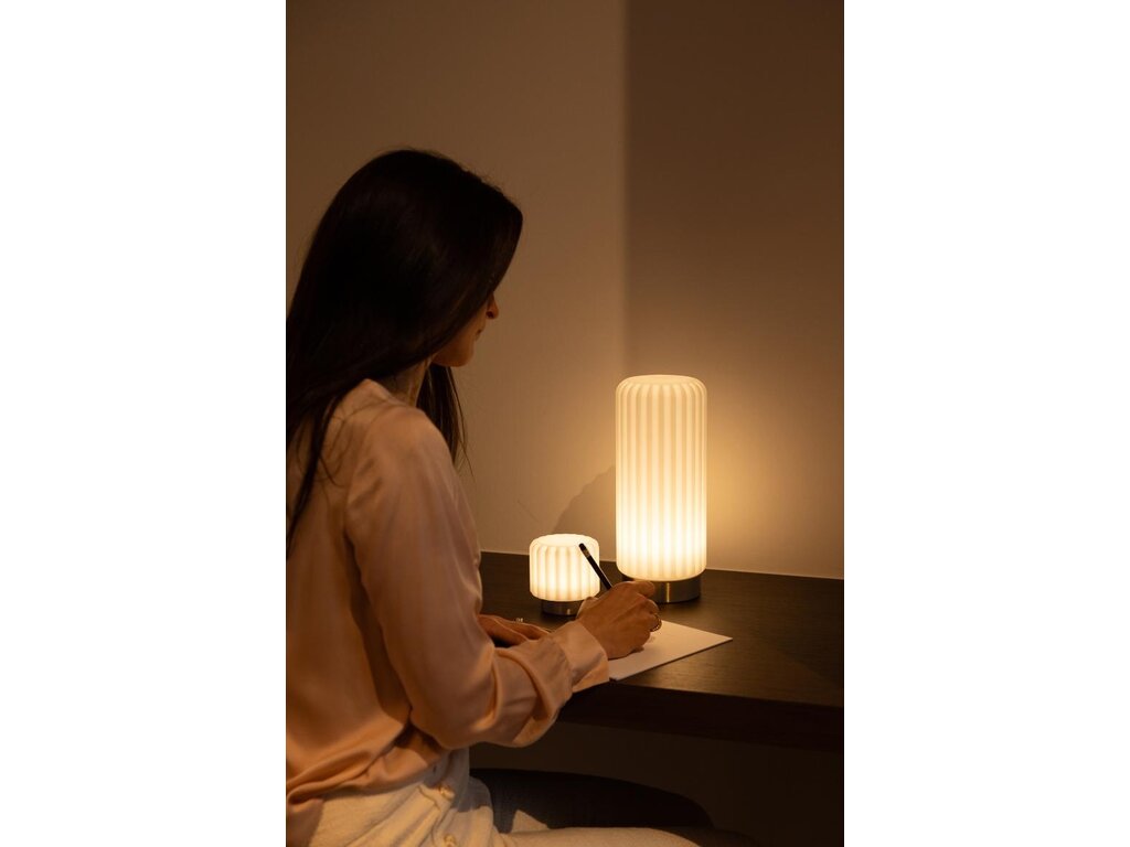 Kies uit de 4 dimlevels door eenvoudig te tikken op de bovenkant van de lamp of via de knop onderaan. Wil je jouw favoriete lichtsterkte vastzetten? Houd de on/off knop 2 seconden ingedrukt en het groene indicatielampje onderaan bevestigt dit. Niet meer vastzetten? Druk kort op de on/off knop.