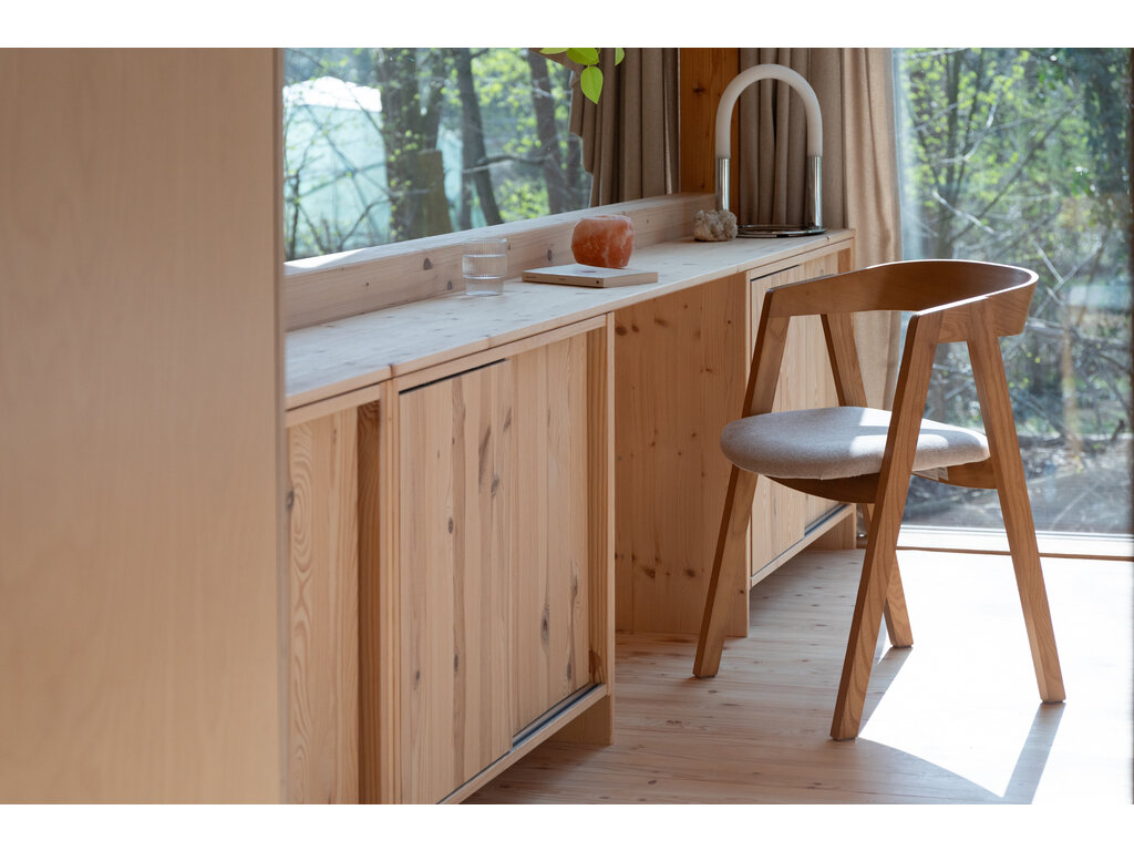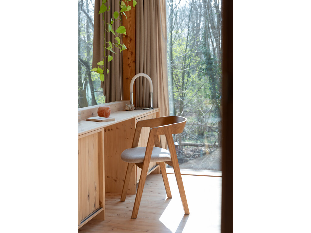 - Voorzien van een zitkussen, bekleed met grof geweven stof in een lichte tint