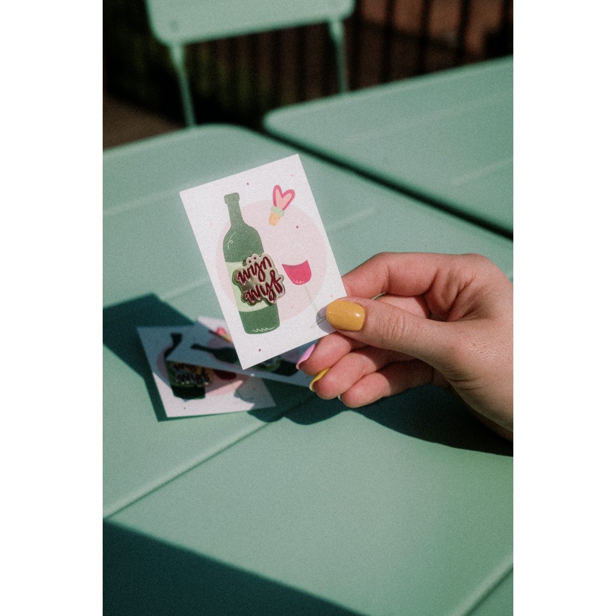 Elke pin komt op een vrolijk geïllustreerd kaartje,