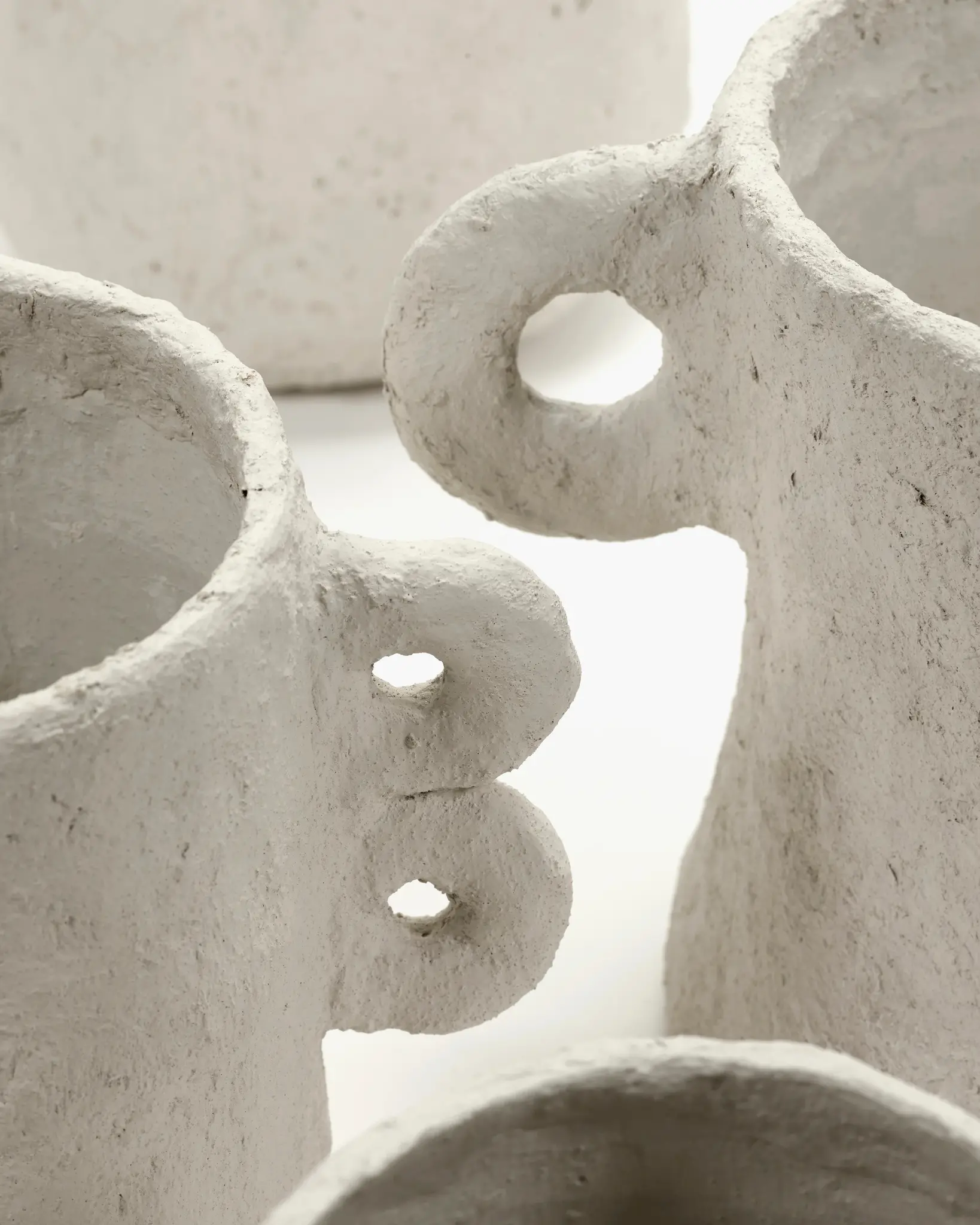 Deze beige papieren maché pot is een echt karakterstuk. De ruwe, zichtbare textuur van het materiaal, de lichtgrijze ‘oertinten’ en de handmatig aangebrachte prints versterken het unieke en ambachtelijke karakter van elk exemplaar. Geen twee stuks zijn exact hetzelfde – perfect voor wie houdt van eigenzinnige, natuurlijke objecten met een verhaal.