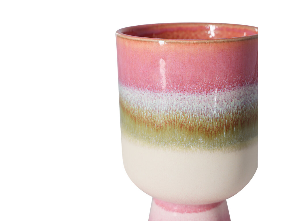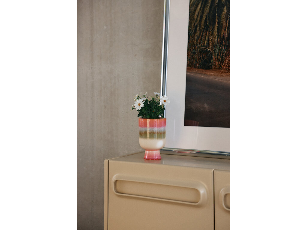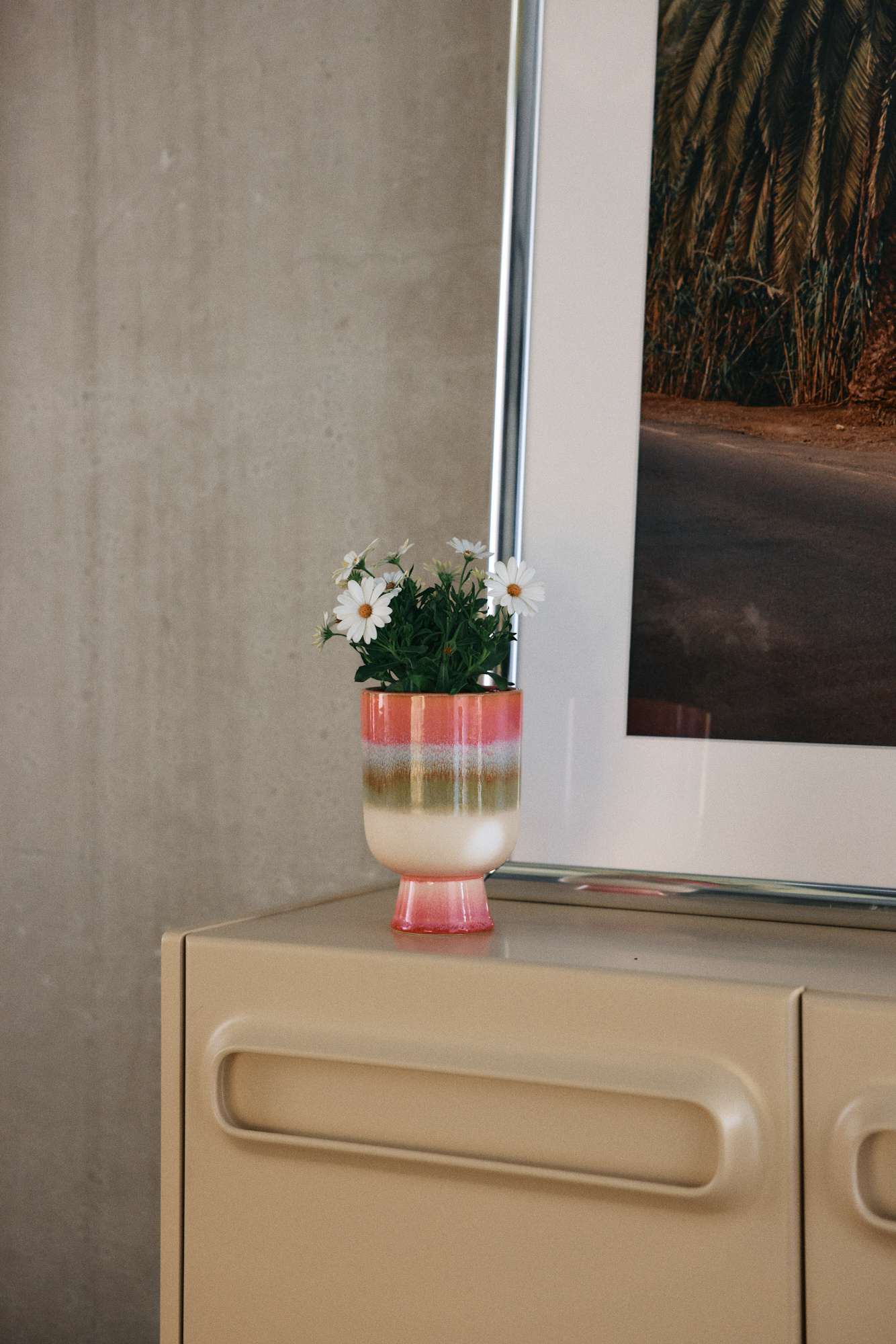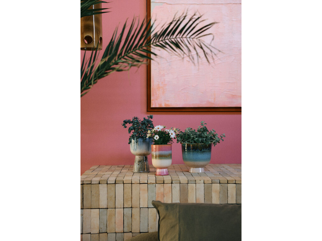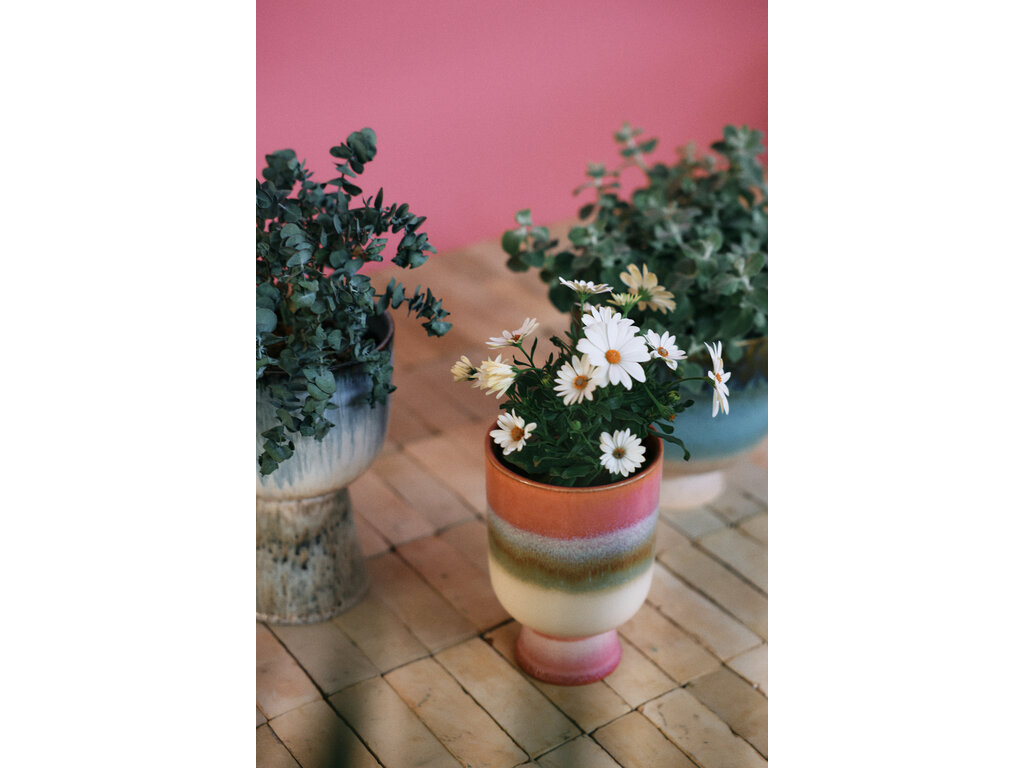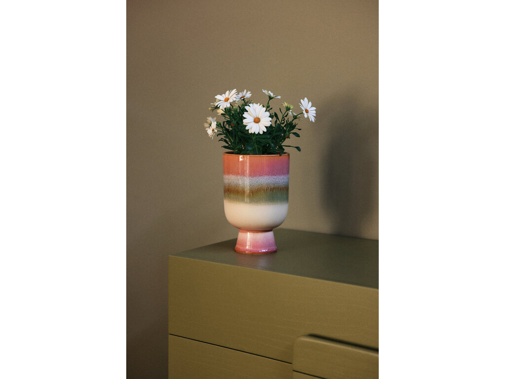 Voeg een speels én elegant accent toe aan je interieur met deze zachtroze bloempot, afgewerkt met witte en subtiele groene tinten. Dankzij de reactieve glazuurlaag heeft de pot een natuurlijke, organische uitstraling, waardoor elk exemplaar uniek is. Mooi afgewerkt en perfect van formaat – een frisse, levendige manier om je favoriete planten in de spotlight te zetten.