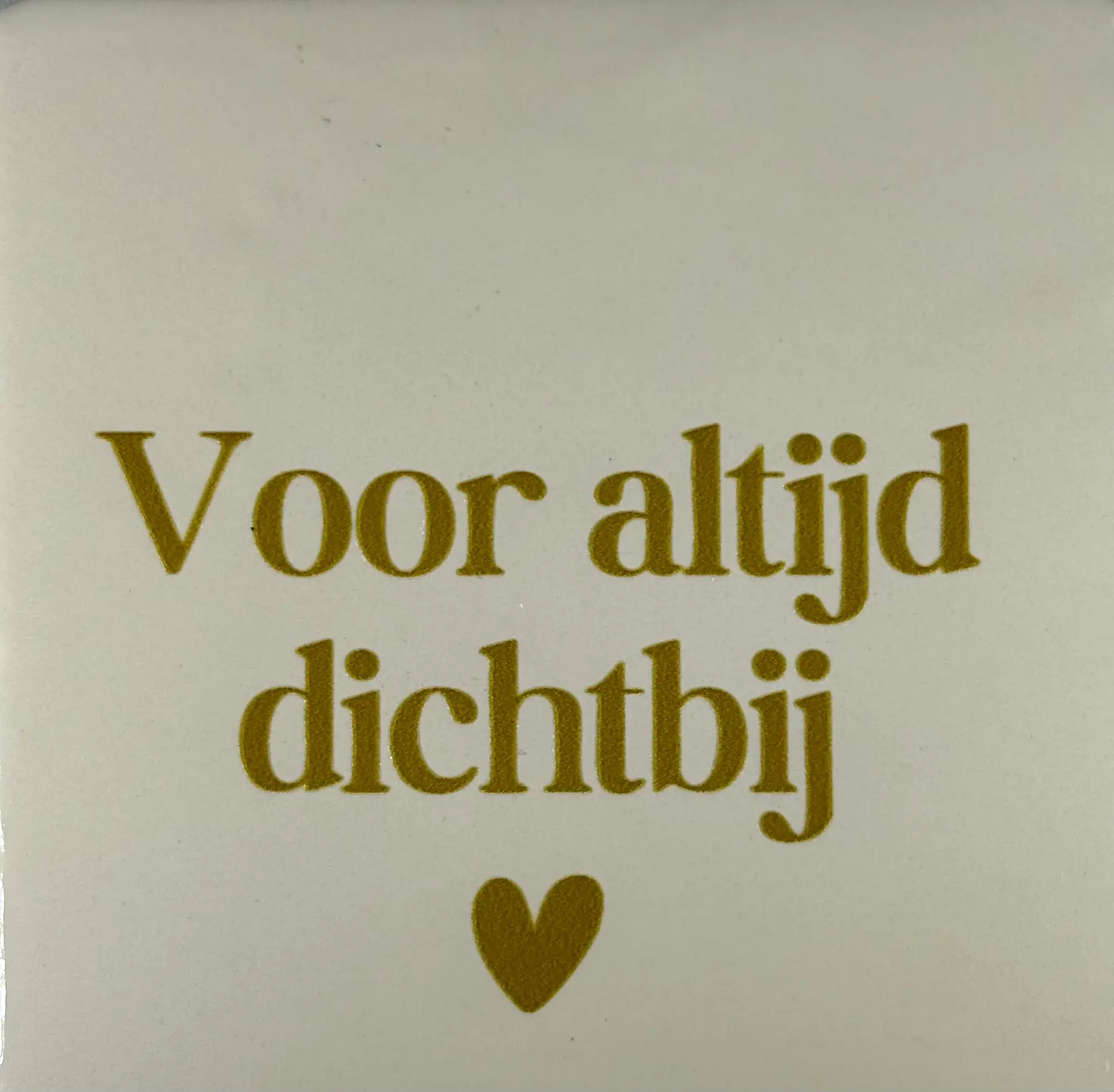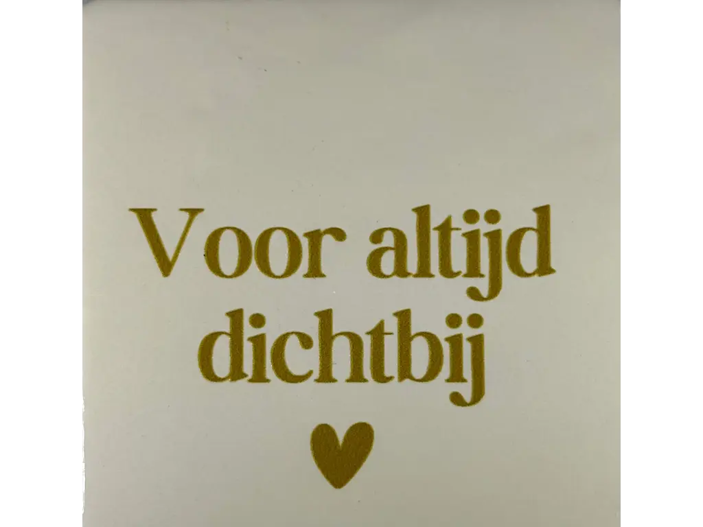 Account aanmakenStijlvol tegeltje in crème met goudkleurige opdruk “voor altijd dichtbij” en een subtiel hartje. Een warme en betekenisvolle decoratie, perfect als cadeau of om een persoonlijk accent aan je interieur toe te voegen.