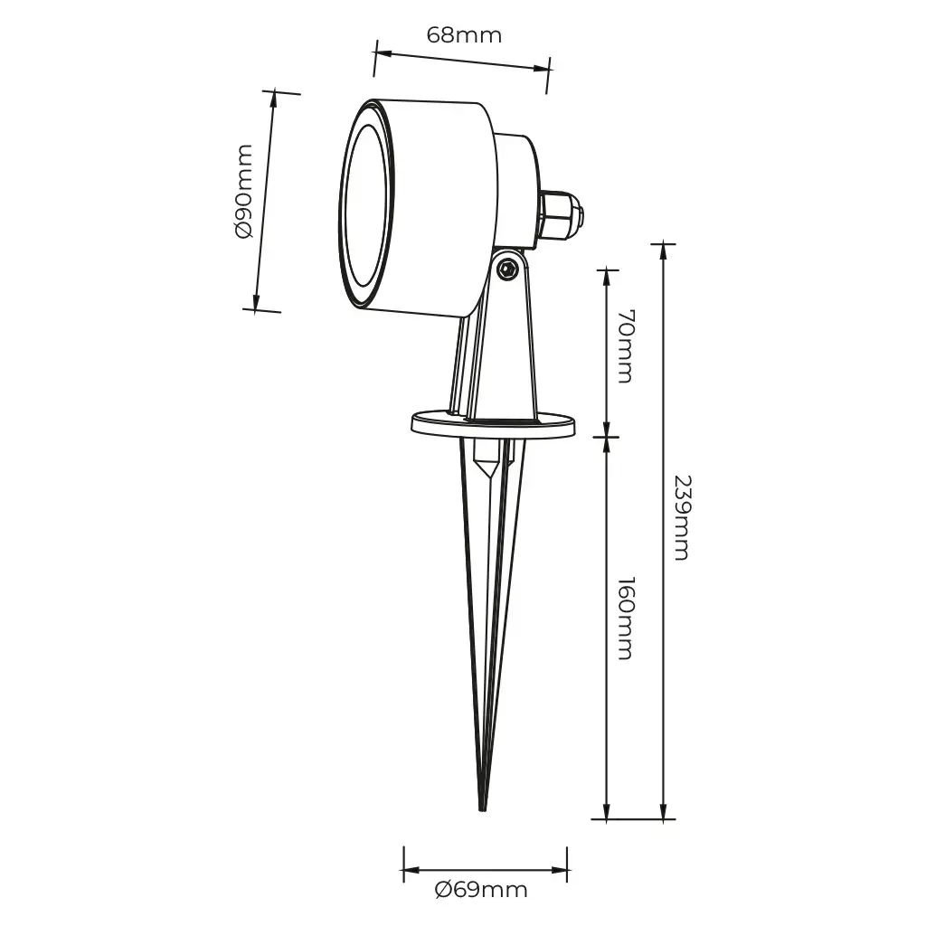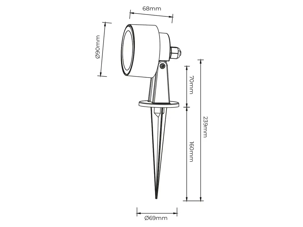 Afmetingen: Totale hoogte 239 mm, lampkop Ø 90 mm, basis Ø 69 mm