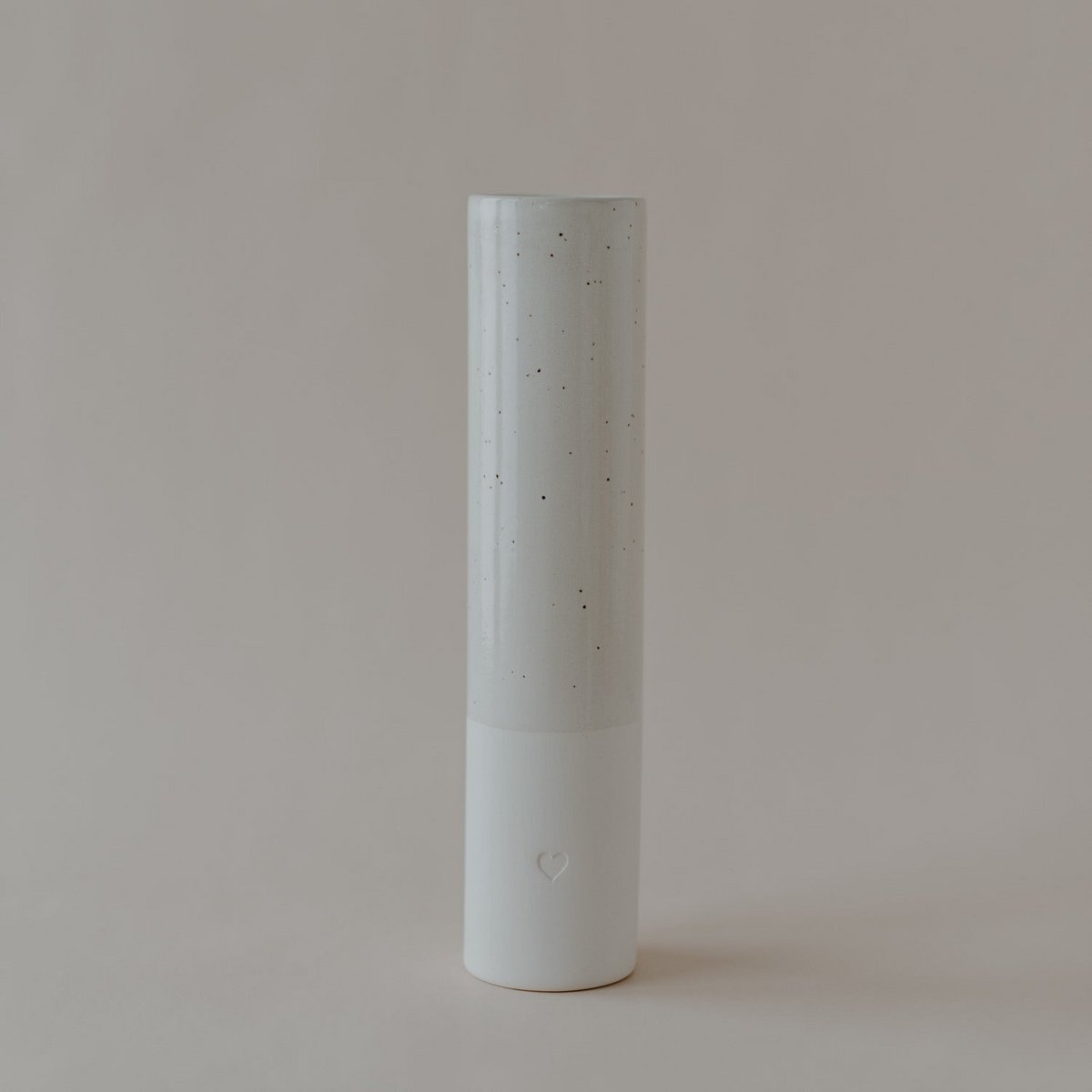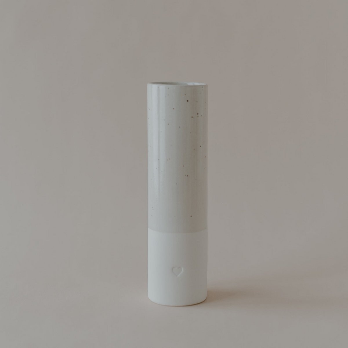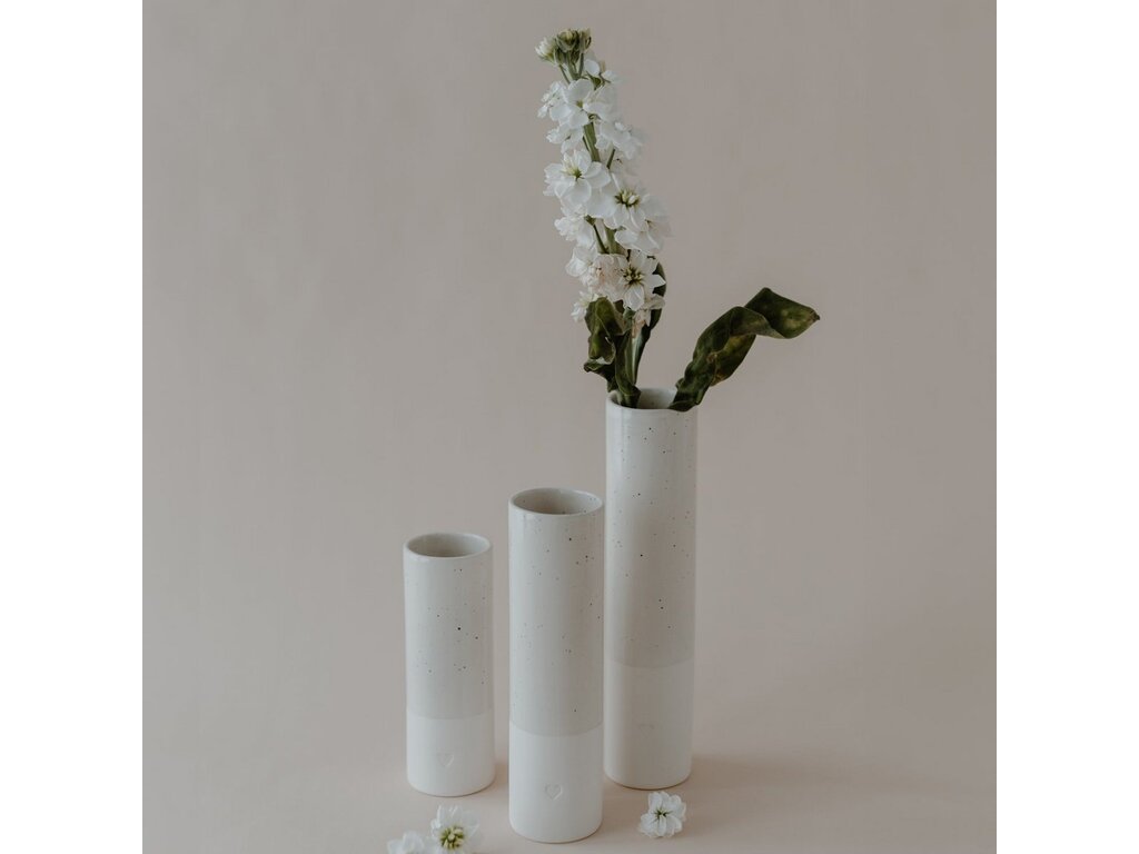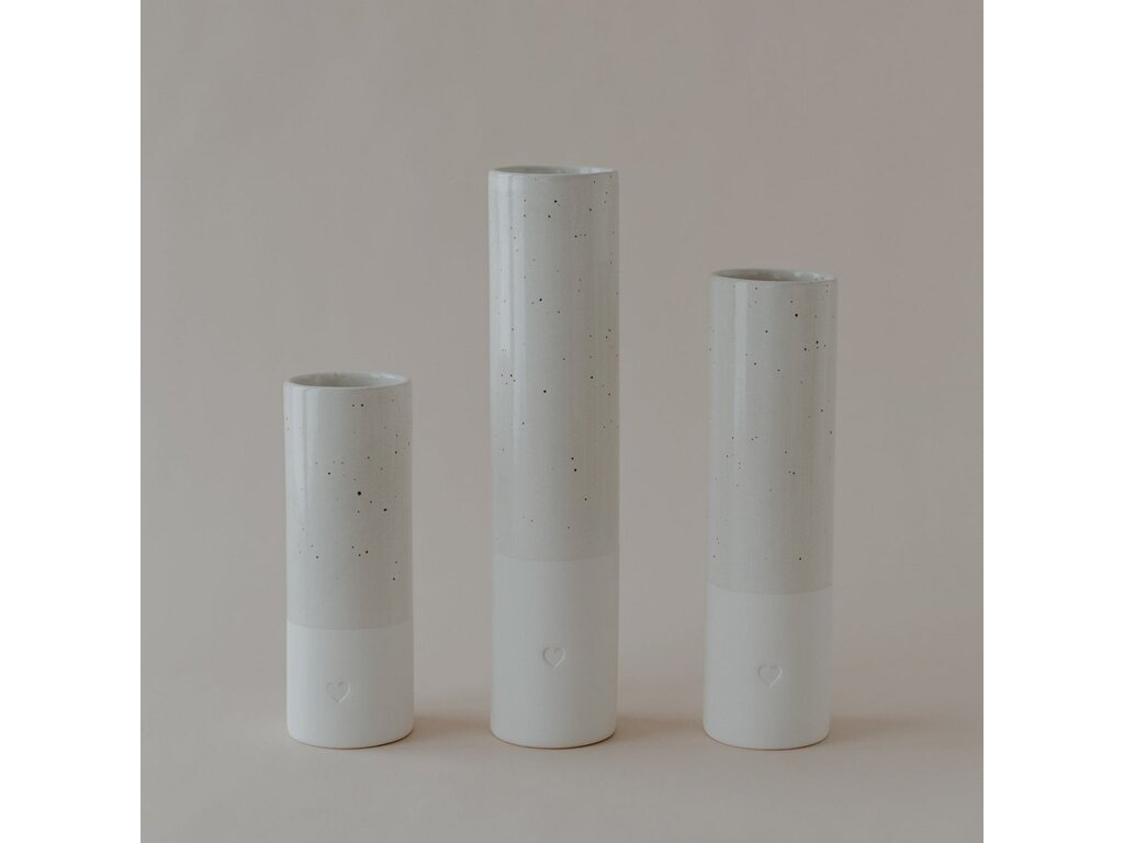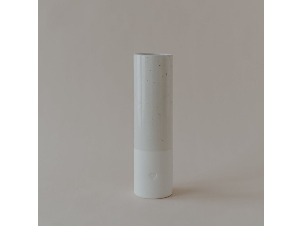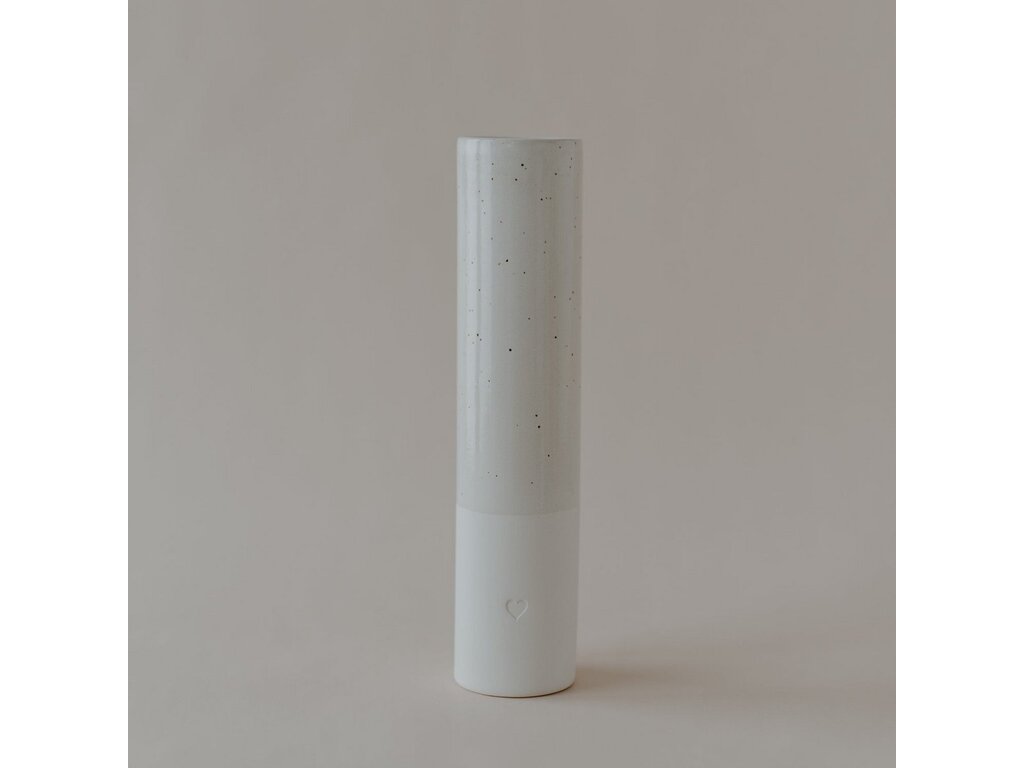 De cilindrische vorm in combinatie met het subtiele hart in blind reliëf zorgt voor een verfijnd en bijzonder design. Elke vaas is met de hand gemaakt, wat elk stuk een eigen karakter geeft. Perfect om je favoriete bloemen extra tot hun recht te laten komen, of om cadeau te geven aan iemand die je lief is.