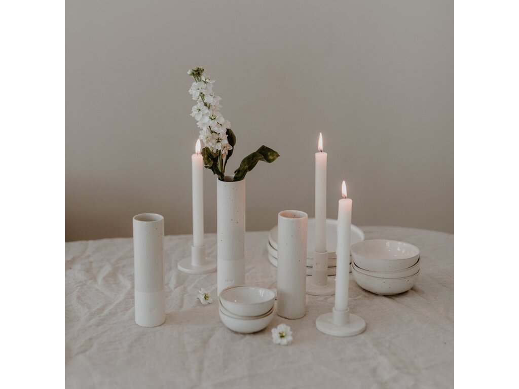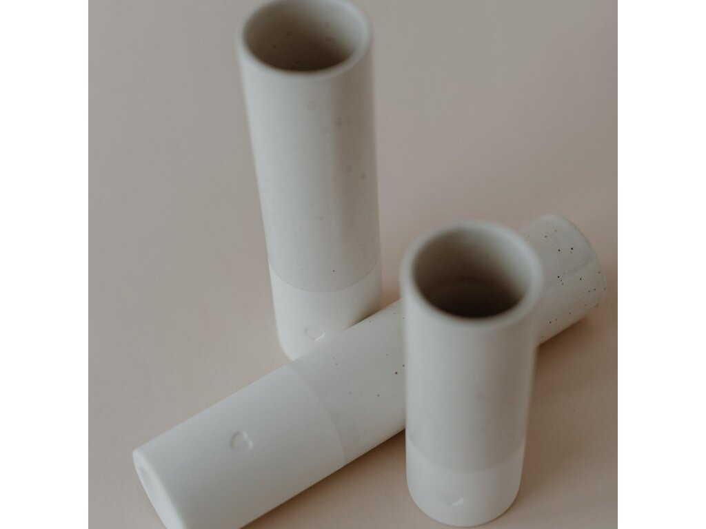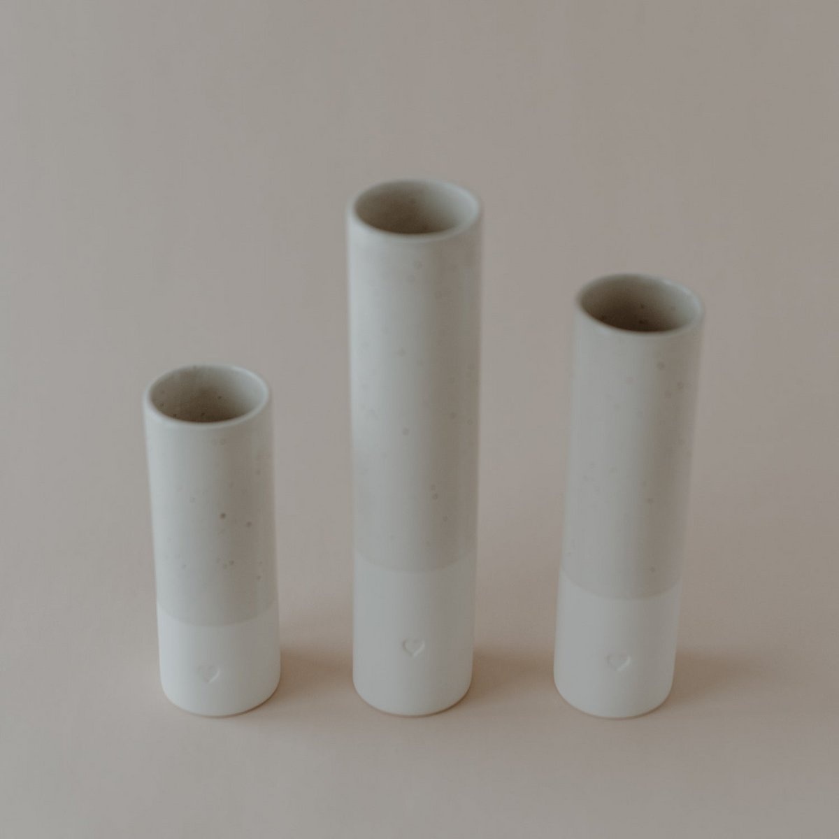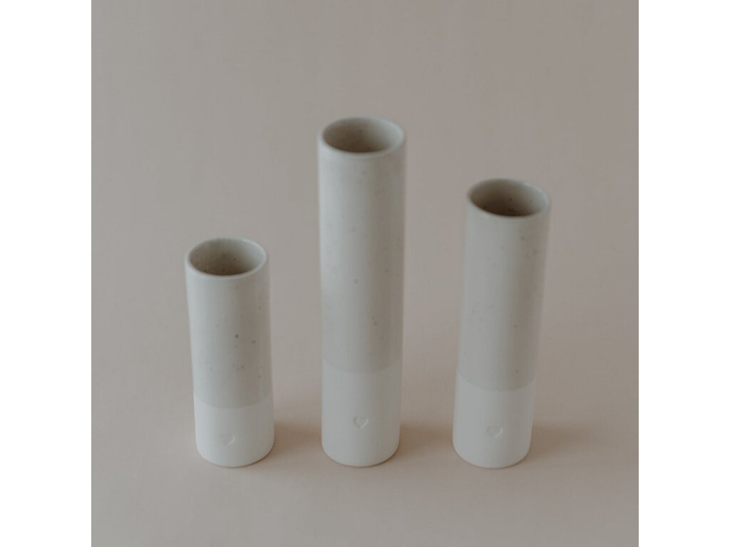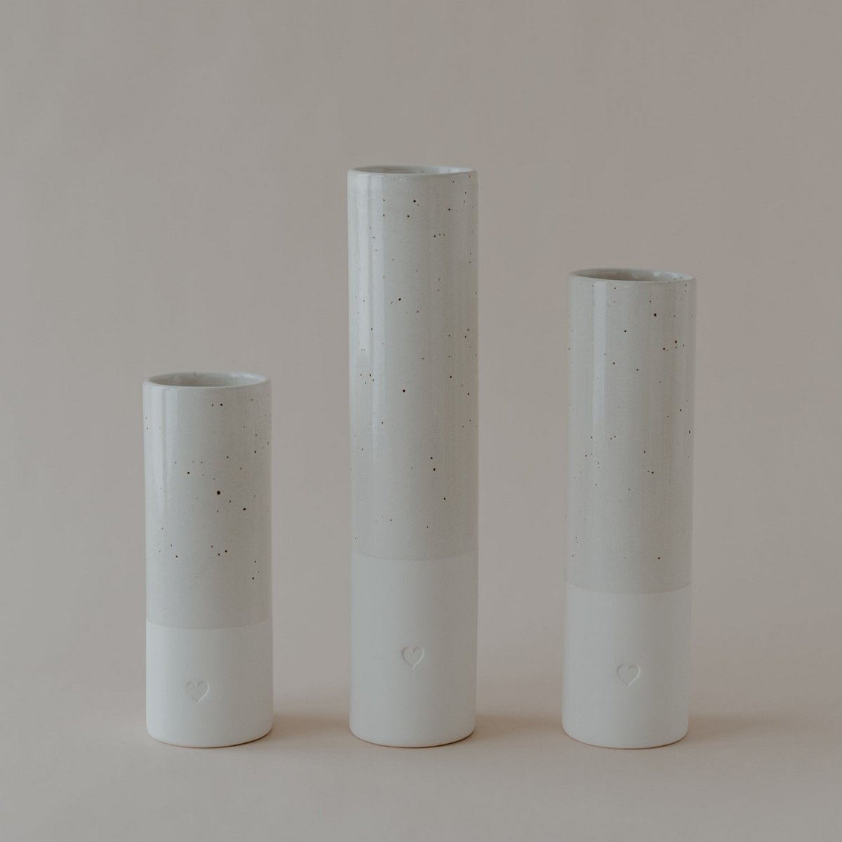 De cilindrische vorm in combinatie met het subtiele hart in blind reliëf zorgt voor een verfijnd en bijzonder design. Elke vaas is met de hand gemaakt, wat elk stuk een eigen karakter geeft. Perfect om je favoriete bloemen extra tot hun recht te laten komen, of om cadeau te geven aan iemand die je lief is.